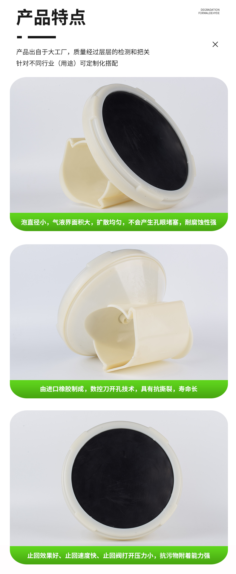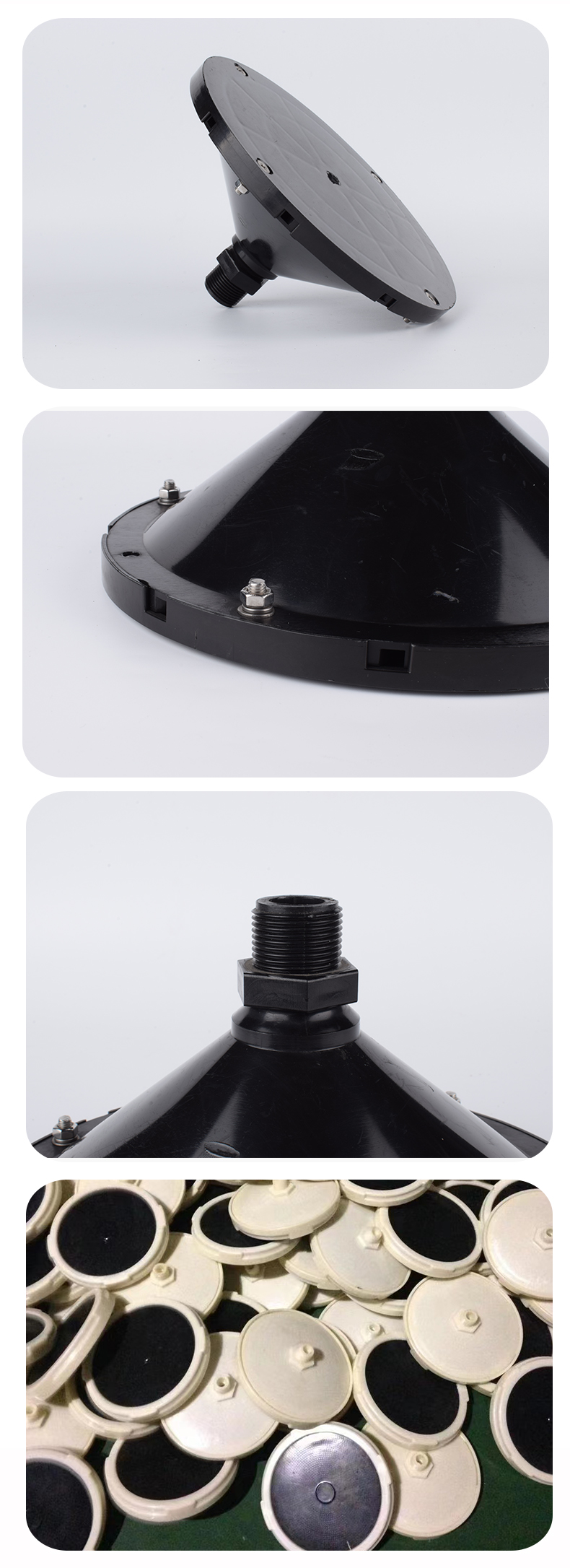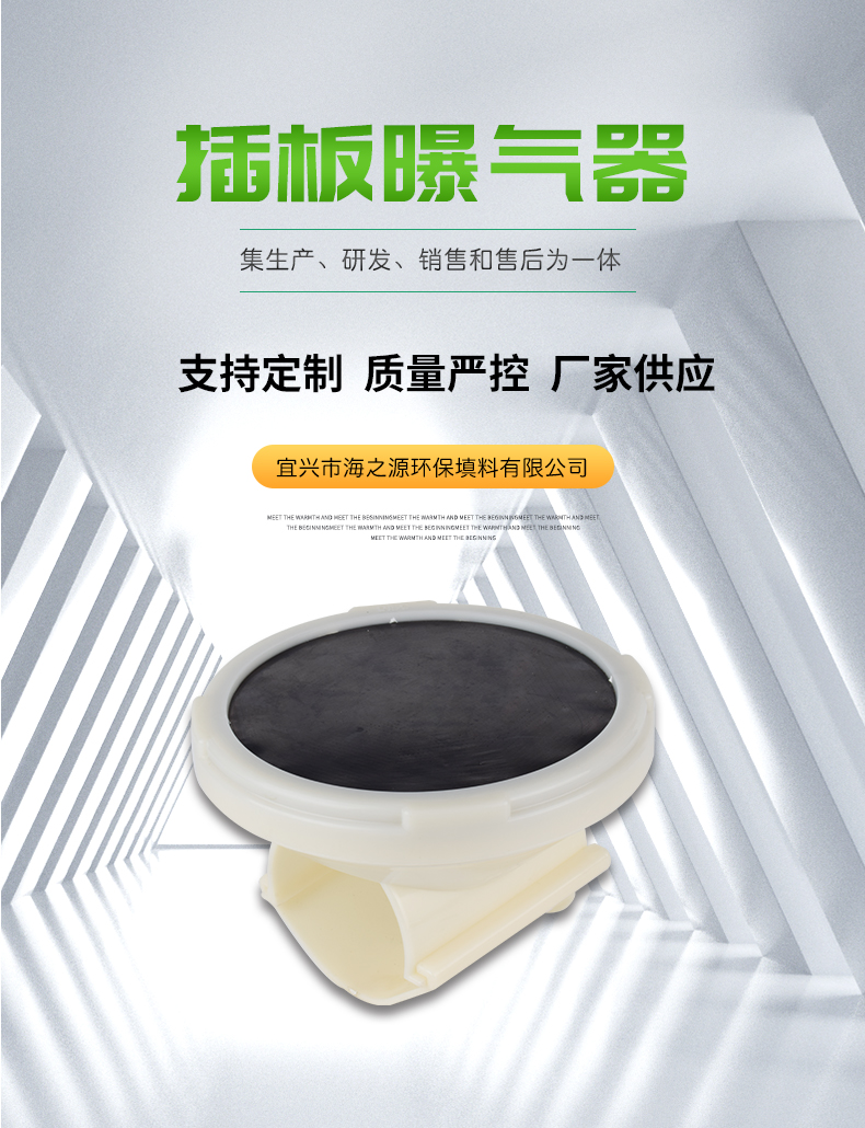 插板曝氣器由底盤、布?xì)獗P、合成橡膠膜片、壓固圓環(huán)、空氣導(dǎo)流板、連接底座與配氣管連接的連接件組成。底座由ABS塑料制成,底座與壓固圓環(huán)上均有螺紋,EPDM橡膠膜片覆蓋在空氣均流板上,在固定圈的作用下能保證在膜片(周圍不漏氣,橡膠膜片在有均勻分布的孔眼,該種橡膠膜片采用多道特殊工藝加工而成,其性能穩(wěn)定,耐中濃度酸、堿、油等介質(zhì)。