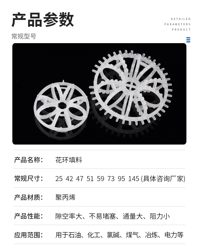 花環(huán)填料也稱梅花環(huán)填料是由許多圓環(huán)結繞而成,由于這種填料的間隙處能有較高的滯液量,可使塔內液體停留時間較長,從而增加了氣液的接觸時間,提高了填料的傳質效率。具有空隙率大,壓降和傳質單元高度低,泛點高,汽液接觸充分,比重小,傳質效率高等特點,多用于氣體洗滌、凈化塔中。