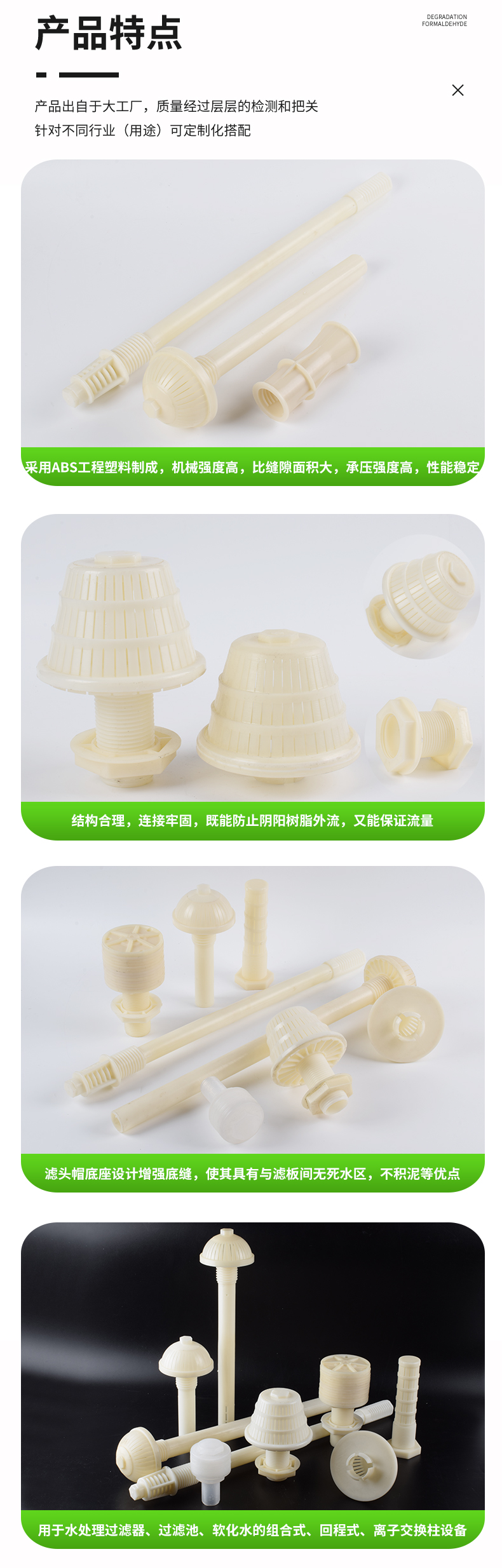 濾頭又叫濾帽,用在濾池配水系統(tǒng)和過濾器中。反沖洗濾頭包括排水帽、濾水帽兩種,均采用ABS工程塑料制成,結(jié)構(gòu)合理,連接牢固,承壓強(qiáng)度高,縫隙不變型,使用效果好,既能防止陰陽樹脂外流,又能保證流量。適用于濾池汽水反沖洗系統(tǒng)和軟化水質(zhì)組合式,壓力式,回程式及離子交換器等水處理設(shè)備的過濾裝置。