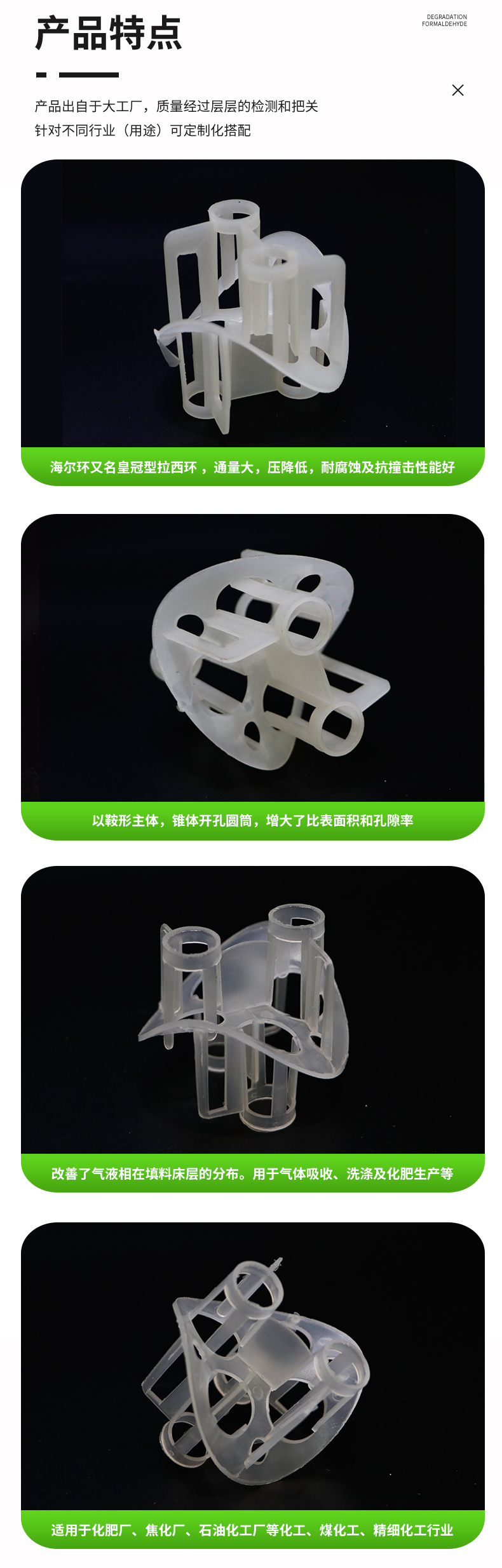 聚丙烯海爾環(huán)填料主要采用聚丙烯的化學(xué)穩(wěn)定性很好,除能被濃硫酸及濃硝酸侵蝕外,對(duì)其他各種化學(xué)試劑都比較穩(wěn)定,同時(shí)它的化學(xué)穩(wěn)定性隨結(jié)晶度的增加還有所提高。產(chǎn)品經(jīng)注塑成復(fù)雜結(jié)構(gòu)的優(yōu)點(diǎn),以鞍形為主體,錐體開孔圓筒,增大了比表面積和孔隙率,改善了氣液在填料層的分布。產(chǎn)品具有低壓降、填料層氣液分布均勻,抗污性強(qiáng)。
